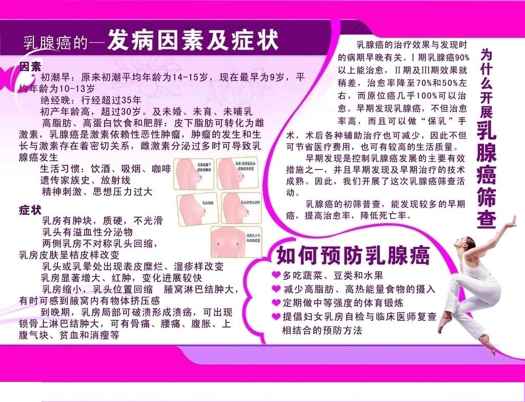 乳腺癌市婦女最常見的惡性腫瘤之一。乳腺癌的發(fā)病率在不斷上升。由于治療方法的不斷改進(jìn),特別是綜合治療的廣泛應(yīng)用,治療效果有了明顯的提高。乳腺癌發(fā)病的相關(guān)因素包括:腫瘤病家族史,尤其市母親、姐妹或姨媽患乳腺癌病史;月經(jīng)初潮年齡過早,絕經(jīng)年齡晚;高脂高蛋白飲食習(xí)慣;乳腺的某些良性疾病。