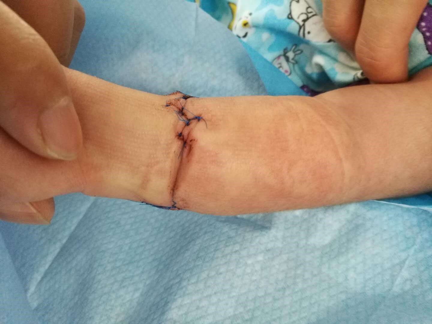余化龍主任說,“責(zé)任重于泰山,醫(yī)生的責(zé)任感和使命感讓我們必須認(rèn)真的對待每一個(gè)患者,我們應(yīng)當(dāng)按照科學(xué)方法,盡早解除患兒的痛苦”。針對患兒皮膚嫰、血管及神經(jīng)細(xì)、手術(shù)部位環(huán)形縮窄,手術(shù)中易受創(chuàng)傷的特點(diǎn),經(jīng)多方論證,確定了“靜吸復(fù)合全麻下行左腕部束帶切除+腕管松解+皮膚Z字成形術(shù)”,術(shù)后立即轉(zhuǎn)新生兒監(jiān)護(hù)室護(hù)理的手術(shù)方案,手術(shù)由余化龍主任和李漢湘教授親自主刀,抽調(diào)科室業(yè)務(wù)精、技術(shù)熟的醫(yī)護(hù)人員全程服務(wù),確保萬無一失。