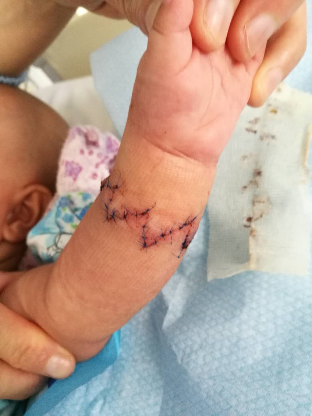 經(jīng)診斷,女嬰患的是“先天性左腕部束帶綜合征”,必須手術(shù)矯正,而且手術(shù)越早,治療的效果越好。但對一個(gè)出生剛剛40天的嬰兒手術(shù),風(fēng)險(xiǎn)和壓力是不言而喻的,皮膚嫰、手術(shù)面積狹小,手術(shù)部位充滿重要血管神經(jīng)、各類器官尚未成熟、麻醉難度大等等,稍有不慎,后果不堪設(shè)想。面對女嬰父母焦慮的眼神和苦苦要求,手足踝顯微外科醫(yī)護(hù)人員深深理解女嬰父母治療愛女病患迫切的心情,為了消除病患,保障女嬰健康成長,余化龍主任牽頭召開手足踝顯微外科、麻醉科、新生兒重癥科等多科聯(lián)合會(huì)診及科室業(yè)務(wù)會(huì)議,精心研究制定手術(shù)方案,防范化解手術(shù)風(fēng)險(xiǎn)、要求各部門嚴(yán)陣以待,麻醉科確保手術(shù)過程中患兒麻醉安全;新生兒重癥科確保嬰兒全麻術(shù)后氣道管理妥當(dāng)、防止各種并發(fā)癥出現(xiàn);手足踝顯微外科做好傷口術(shù)后管理,確?;純浩つw血運(yùn)良好。