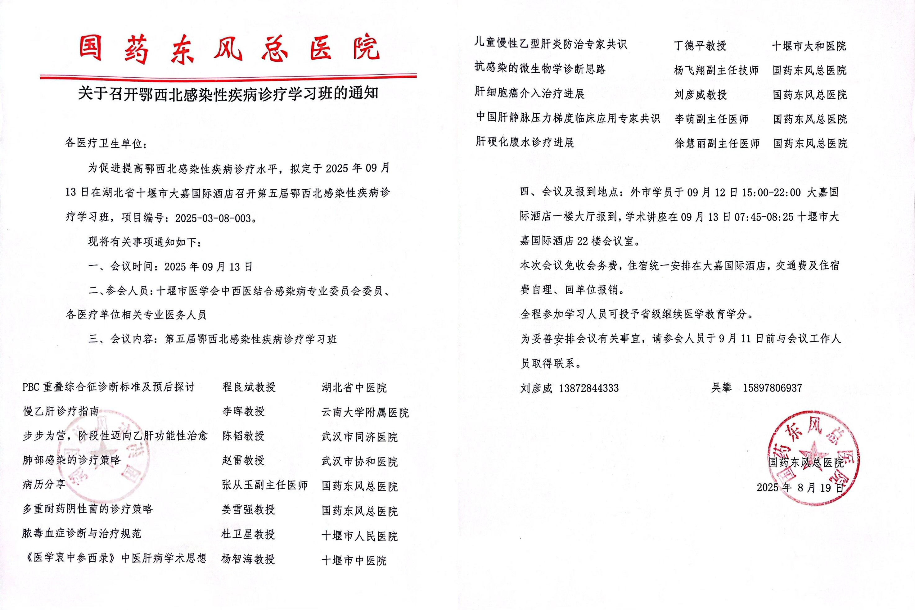 關(guān)于召開(kāi)鄂西北感染性疾病診療學(xué)習(xí)班的通知