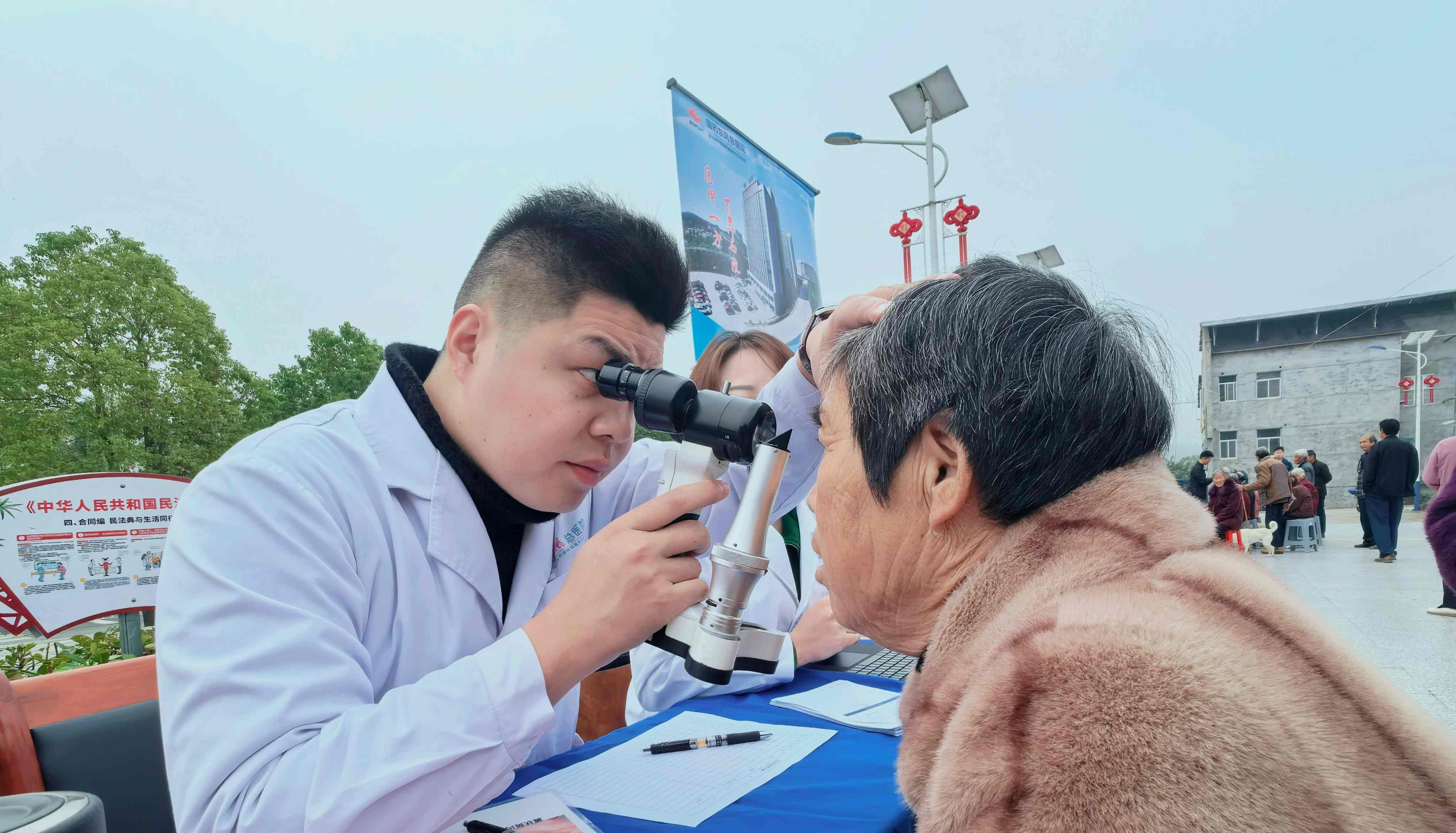 當(dāng)天清晨,國藥東風(fēng)總醫(yī)院選派乳腺·甲狀腺外科、脊柱外科、老年醫(yī)學(xué)科、內(nèi)分泌代謝科、呼吸與危重癥醫(yī)學(xué)科、神經(jīng)外科、眼科、消化內(nèi)科等8個(gè)科室的專家團(tuán)隊(duì)早早抵達(dá)高嶺村村委會(huì)前廣場(chǎng),開展義診服務(wù)。
